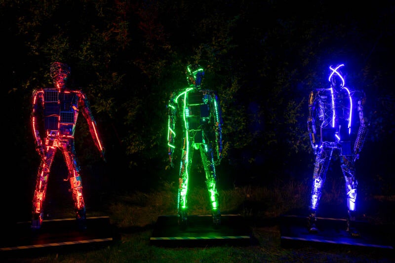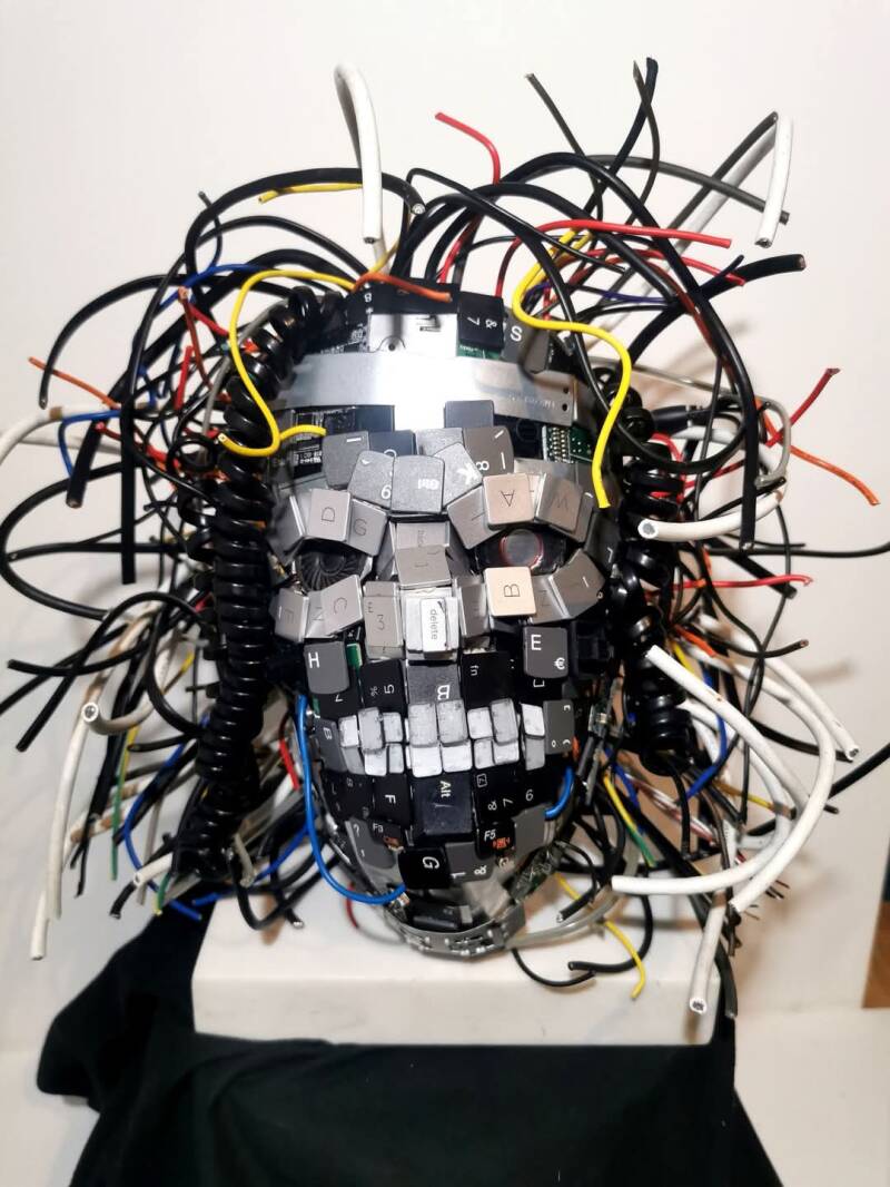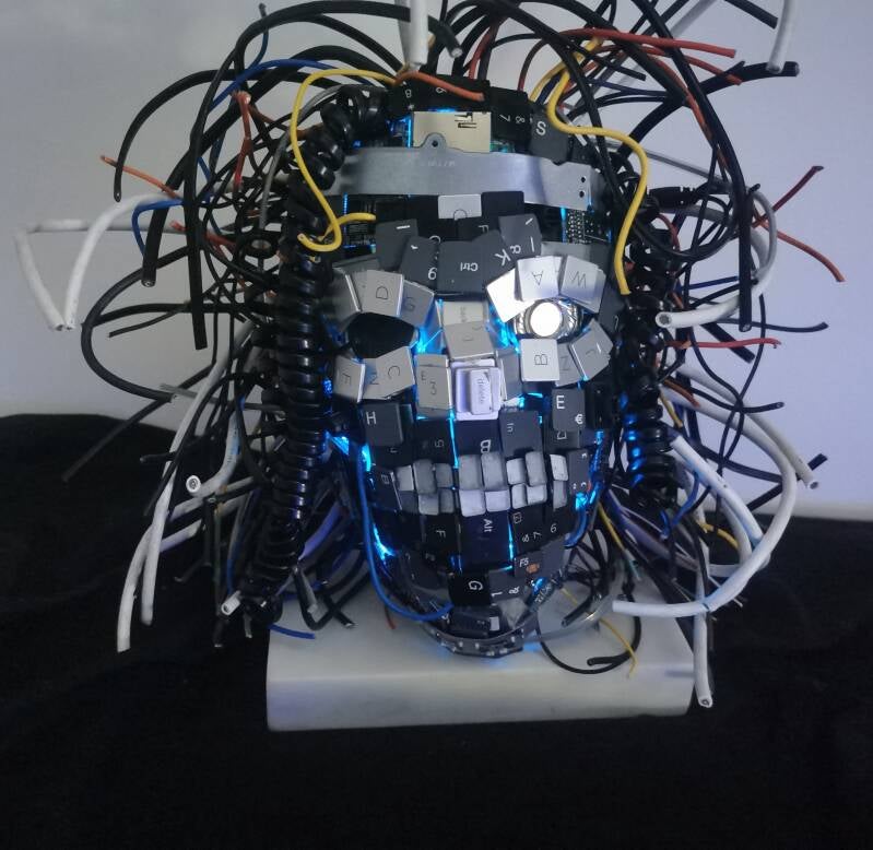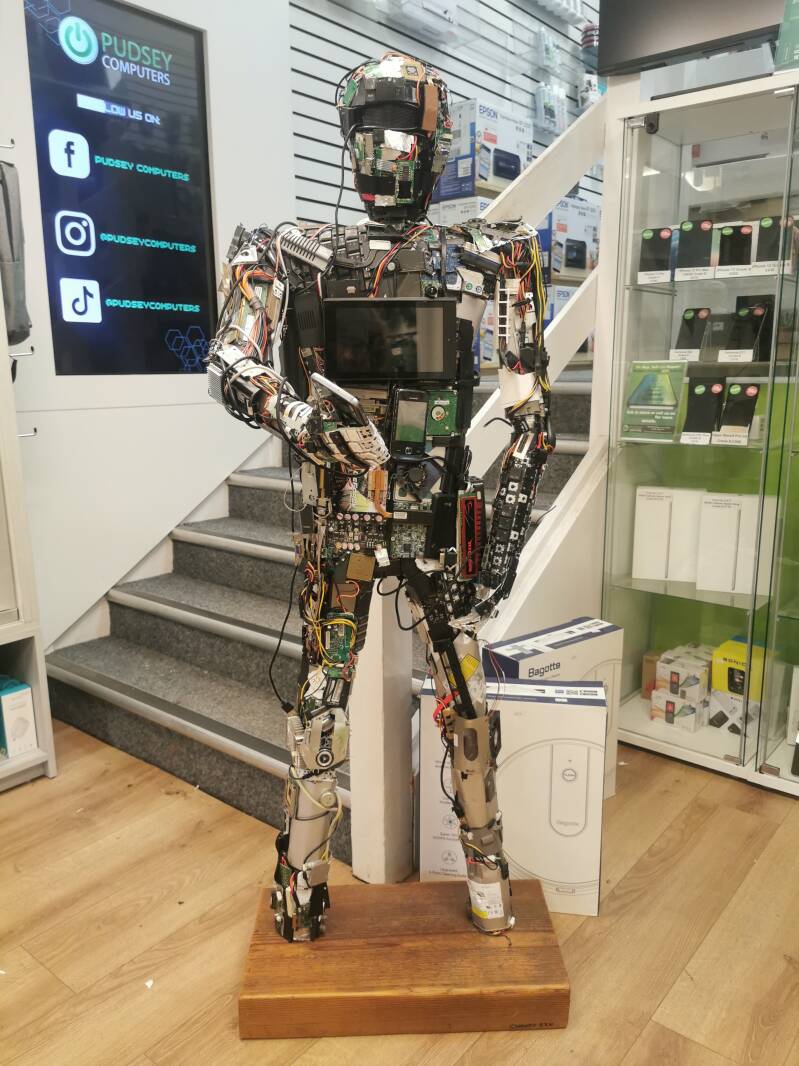 This humanoid figurative sculpture is crafted from discarded technology and serves as a thought provoking commentary on our reliance on technology