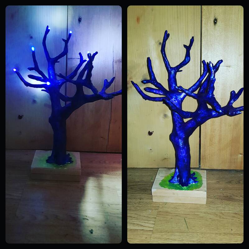 Handcrafted purple clay tree with LED lights. Each branch is carefully molded and painted for a one-of-a-kind piece. The LED lights bring a touch of magic and enchantment, making it a beautiful decoration for any space