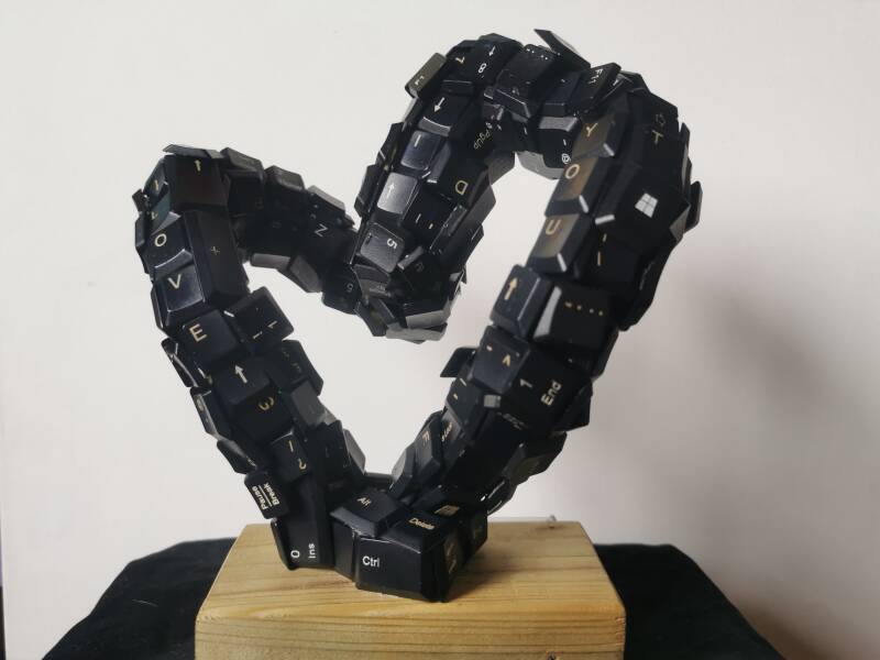 This sculpture embodies the varied emotions of love. Crafted from keys repurposed from three keyboards, each carefully placed to form a dynamic abstract heart. The keys spell out significant words: "I," "love," "you," and "heart," alongside symbolic keys like "Ctrl," "Alt," and "Delete," symbolizing navigation, alternative perspectives, and the need for renewal in relationships. Notably, this sculpture promotes sustainability by transforming waste technology into art.